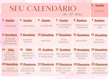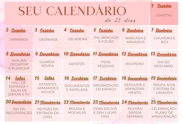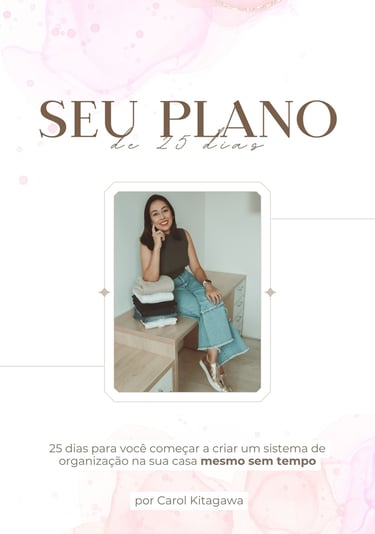 Material em PDF que contem um Plano dividido em 25 dias para você encaixar na sua rotina e montar um sistema de organização que funcione na sua casa